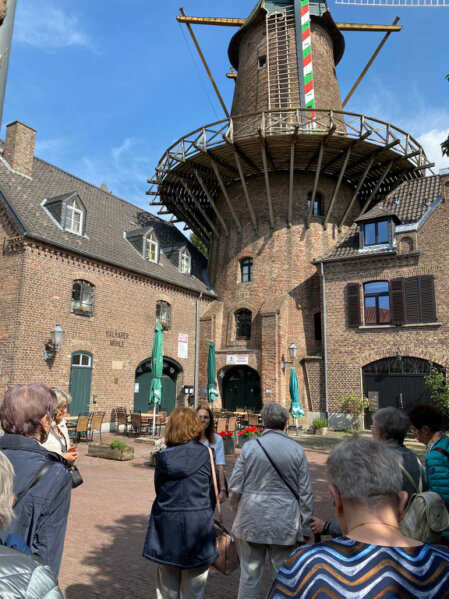 Weiter ging es zur Kalkarer (Wind-) Mühle, erbaut 1770 von einem französischen Leder-fabrikanten. Um den Wind aus allen Richtungen nutzen zu können, wurde ein 28 m hoher Mühlenturm errichtet. Im 19. Jhdt. kamen dann eine Scheune und ein Müllerhaus hinzu. Das ursprüngliche Müllerhaus wurde um 1910 durch ein 2-geschossiges, neugotisches Wohnhaus ersetzt. Die drei Gebäude, Mühle, Scheune und Müllerhaus stehen unter Denkmalschutz. Heute erfüllt die Windmühle erneut ihren ursprünglichen Zweck: Hier wird an bestimmten Tagen wieder Korn gemahlen.