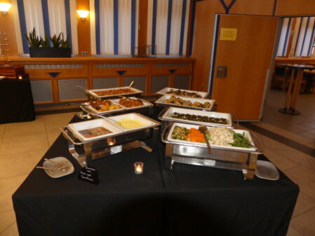 Nach einer Umkleidepause im Hotel ging es wieder mit dem Bus von Rees zum festlichen Abendessen mit unseren Damen in das Casino Kalkar. Der Saal war festlich arrangiert und erinnerte an vergangene gute Zeiten als die Räume der Heimgesellschaften häufig Treffpunkt für herausgehobene gesellschaftliche Anlässe waren. Die Tischgruppen waren groß genug für das "Zusammenfinden in Neigungsgruppen", um so gemeinsam die Eindrücke des Tages im Gespräch nachzubereiten. Die Kasino-Küche zeigte sich mit einem vielseitigen Buffet von der besten Seite. Der Heimfeldwebel sorgte mit freundlichen Ordonnanzen dafür, dass niemand Durst leiden musste.